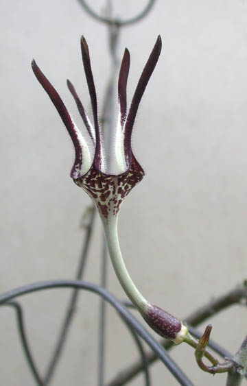 August 2006 - Last year we had a very dry summer and my stapelliformis plants were prolific with their flowers. It may be in part because I let the green flowered C. serpentina touch and root in the ground. They were even visited by the small white-etailed gnats I had seen before. But no seed pods formed. Here's a photo of the main plant and the serpentina vine.