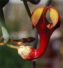 This plant is native to Somalia, Ethiopia, Uganda, Zaire, Chad, Cameroon, Burkina Faso, Senegal, with sub species in Tanzania, Zaire, Uganda, and Kenya. It has been known since1838. This plant has medium thick stems (under 1/4" in diameter) and short spade shaped succulent leaves without marks. The flowers are rather dull in color and there are a lot of them. Unlike most other ceropegias, this one will bloom on the same flower stalk each year, much like its relatives the hoya branch of the family. As the plant ages the flower stalk lengthens and the scars of past flowers spiral around it in a raised line of white spots. So, for this plant I would not recommend cutting it back each year. If temperatures are warm enough, it will bloom before it forms leaves as it comes out of its winter resting period. I suspect that if the plant is kept warm enough it would remain in continuous growth and flower. September 1999 - I have seen other varieties of aristolochiodes in pictures in ASKLEPIOS. Many of them are very attractive and much more worth growing than the variety shown here. They just don't seem to be available in the marketplace. |
