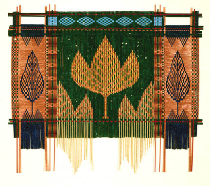 This tapestry is a closer look at leaf shapes and trying to make curved lines with squared pieces. The tapestry is mounted on cream colored cloth without a frame, 39" tall by 45" wide. Price US $3200.00
