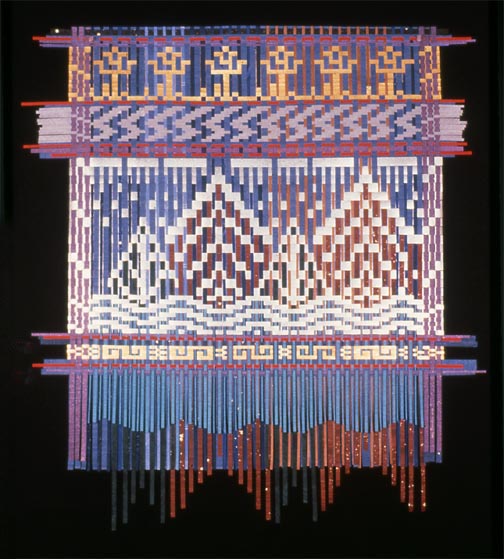 This is a very large tapestry and it was one of the first in which I began to use thinner colored strips of paper to add definition and atmosphere. The main motif is woven with bold inch-wide strips in metallic silver. Open areas of the design are filled with the layered colord strips to separate mountain from pine tree and river. Silver clouds overhead are dropping squared snowflakes. Size is approximately 50" tall by 50"wide.