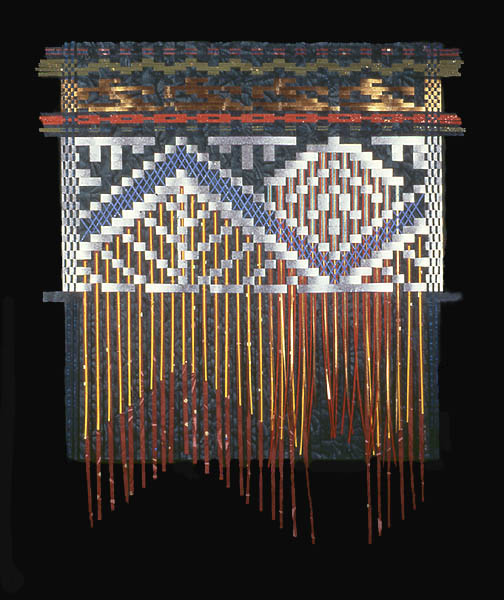 This was the first tapestry with an alpine theme. Woven with bold strips of metallic paper interlaced with thinner colored strips, this tapestry is kind of a flattened picture of a mountain, a pine tree and a river. Autumn leaf colors fill in the open areas giving the piece a seasonal atmosphere.