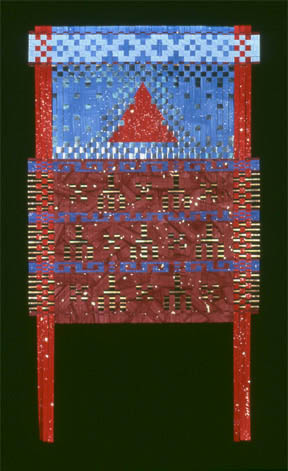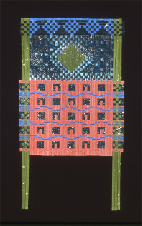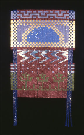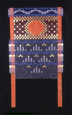 These Tapestries were commissioned for a hotel in Upstate New York. They were woven from 3/8" wide strips of pastepaper for a graphic and primitive effect. The designs are based on the Renaissance Orders in architecture, circle, semi circle, triangle and square. The lower parts of the designs are ideas about villages, gardens and the weather.