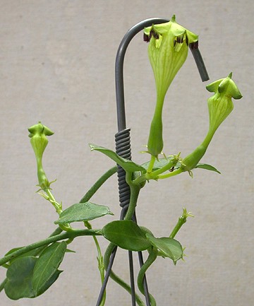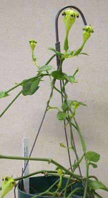 This plant is native to Ndumu Game reserve (among other places?) My research is in complete at this time. It has been known since ??. This plant has thin stems and spade-shaped very succulent leaves without marks. The flowers are a bright chartreuse and they are plentiful when the vine starts to bloom. Flowers will follow each other at the same node so there are flowers and buds in all stages at the same time. |