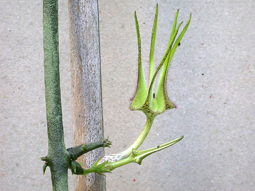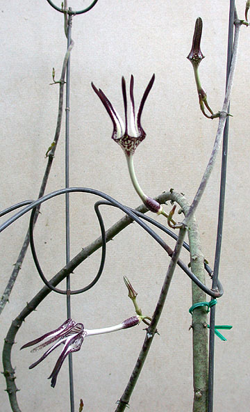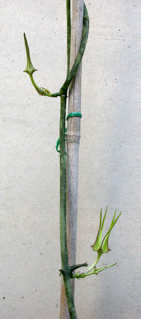 August 2006 - Last year we had a very dry summer and my stapelliformis plants were prolific with their flowers. It may be in part because I let the green flowered C. serpentina touch and root in the ground. They were even visited by the small white-etailed gnats I had seen before. But no seed pods formed. Here's a photo of the main plant and the serpentina vine.