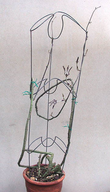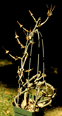 The stapeliiformis in these pictures bloom at about two feet in length. The serpentina variety of stapelliiformis is a much shyer bloomer, I've had one plant for almost three years and have seen only one flower. It grew to quite a length before it bloomed, and it had a very elegantly colored flower, all green and white without any red in it. Unfortunately, I wasn't able to photograph it and haven't had another chance. Yet. . . (March 1998) |
