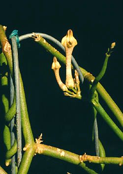 This plant is native to Somalia, Ethiopia, Uganda, Zaire, Chad, Cameroon, Burkina Faso, Senegal, with sub species in Tanzania, Zaire, Uganda, and Kenya. It has been known since1838. This plant has medium thick stems (under 1/4" in diameter) and short spade shaped succulent leaves without marks. The flowers are rather dull in color and there are a lot of them. Unlike most other ceropegias, this one will bloom on the same flower stalk each year, much like its relatives the hoya branch of the family. As the plant ages the flower stalk lengthens and the scars of past flowers spiral around it in a raised line of white spots. So, for this plant I would not recommend cutting it back each year. If temperatures are warm enough, it will bloom before it forms leaves as it comes out of its winter resting period. I suspect that if the plant is kept warm enough it would remain in continuous growth and flower. September 1999 - I have seen other varieties of aristolochiodes in pictures in ASKLEPIOS. Many of them are very attractive and much more worth growing than the variety shown here. They just don't seem to be available in the marketplace. |