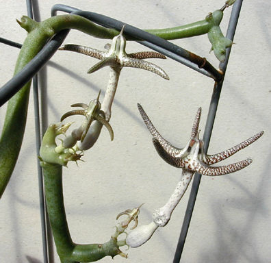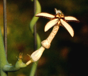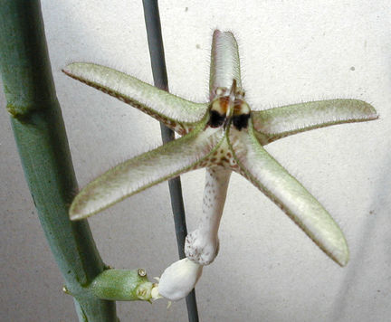 This plant seems to like it very hot and bright. It has been difficult to cultivate and keep in these northern latitudes. This climbing vine has interesting buds as well as a dramatic flower. The familiar bullet shaped ceropegia bud has 5 claws that curl under the top. When the flower opens, the claws split and the top of the flower flattens out increasing to almost 2 inches in diameter. The inside surface of the opened claws is like white velvet, this colorarion and texture makes the flower noticable from over twenty feet away.