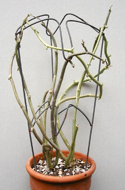 Late last summer I ordered some new devechii from Miles To Go to replace the one that I lost that's pictured above. It was listed as a white flowering variety but when it bloomed these were the flowers. Pretty dull when compared with my original plant. I recieved two very nice plants with good roots and one plant had buds on it. They were planted in the altered Barad mix described in General Culture with bent tomato hoops to grow on. This variety seems to be quite vigorous as it has been growing since Christmas, they're a little stretched because I have them inside my studio about 4 feet from flourescent lights that light the space for me (not the plants). |