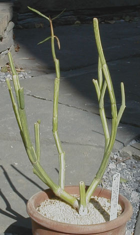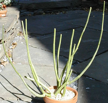 This plant is native to the Canary Islands and has been described since 1812. This plant is fairly easy to grow . It has a long 'dormant' period and will tolerate erratic watering. Last winter I had it in my studio under normal flourescent studio lighting, it began to grow and had more leaves on it than I had ever seen before. It had a few flowers in May after I took it back outside and it had lost most of its leaves. The plant has bloomed sparsely every year that I've had it. It is in a clay pot, in a soilless mix to which I've added traction grit and marble chips. The marble chips were added to stabilize the plant in the pot. The plant will get top heavy and pull itself out of a lighter soil mix. |