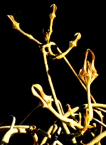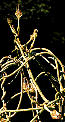 MARCH 98: I put three rooted cuttings into a 10" clay pot in orchid seedling mix with a 2' trellis, and grew it outside. They grew well and flowered all summer. There is a large pair of warty seed pods on it now. |