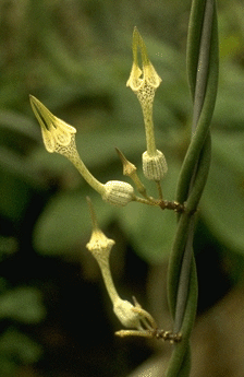 This picture was taken in a friend's greenhouse. It has never grown well for me. It seems to need warmth and very bright light. When it gets those things it performs spectacularly growing into the rafters and blooming profusely.