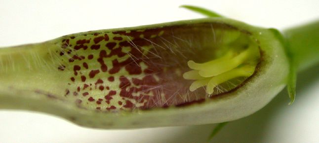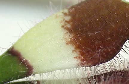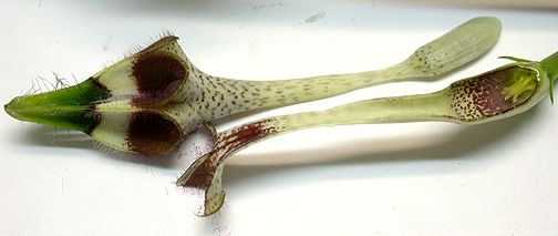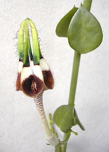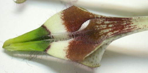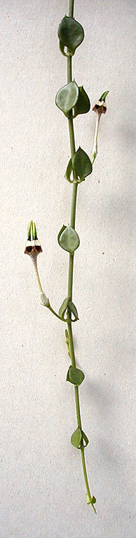 This plant is native to the Cape Province, it has been listed since 1894. This plant has very succulent leaves on a medium sized trailling vine. The flowers are very large (over 2 inches tall) and dramatic. I got this plant from Paul Shirley well over a year ago as a cutting. It has been very slow to grow to its little more than 24 inch length. It was thrilling to see buds and finally the opened flowers. It's August in New York , a particularly hot and muggy one and this is one of the highlights of my garden. |