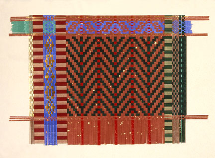 This warm tapestry was woven from an idea about papyrus plants. The colors and boldly striped papers give it an Egyptian feeling.