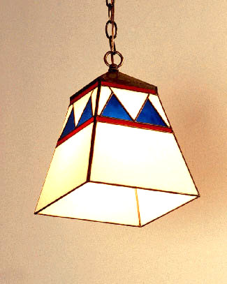 This is an example of the type of work that can be commissioned from my studio. It is made of copper and sandblasted leaded stained glass. The lamp is 8" square at the base and is 11 1/2" tall (from the bottom edge of the shade to the top of the circular ring.)